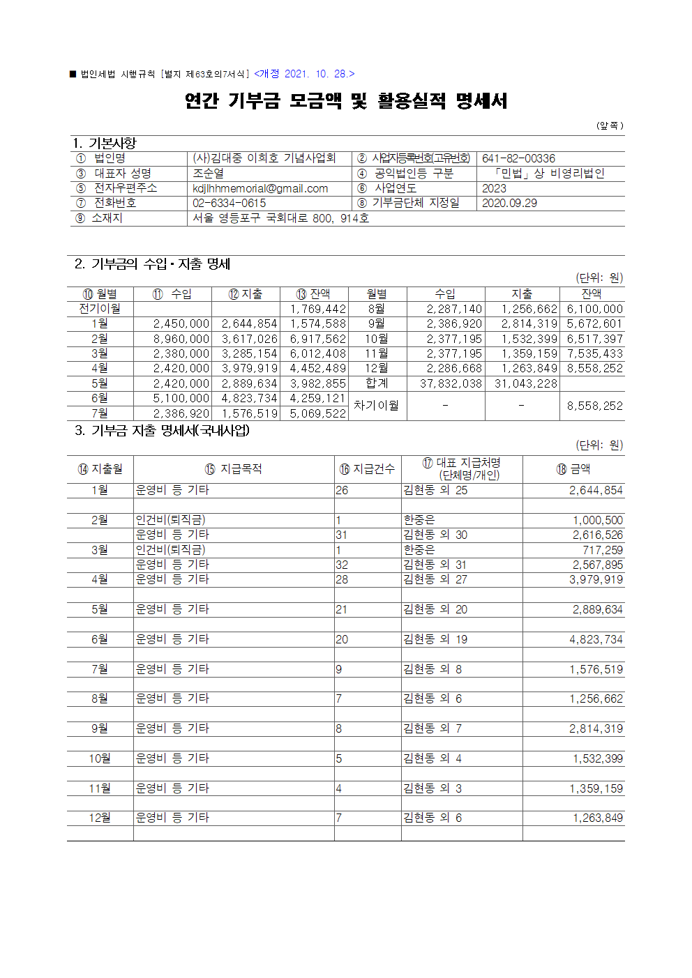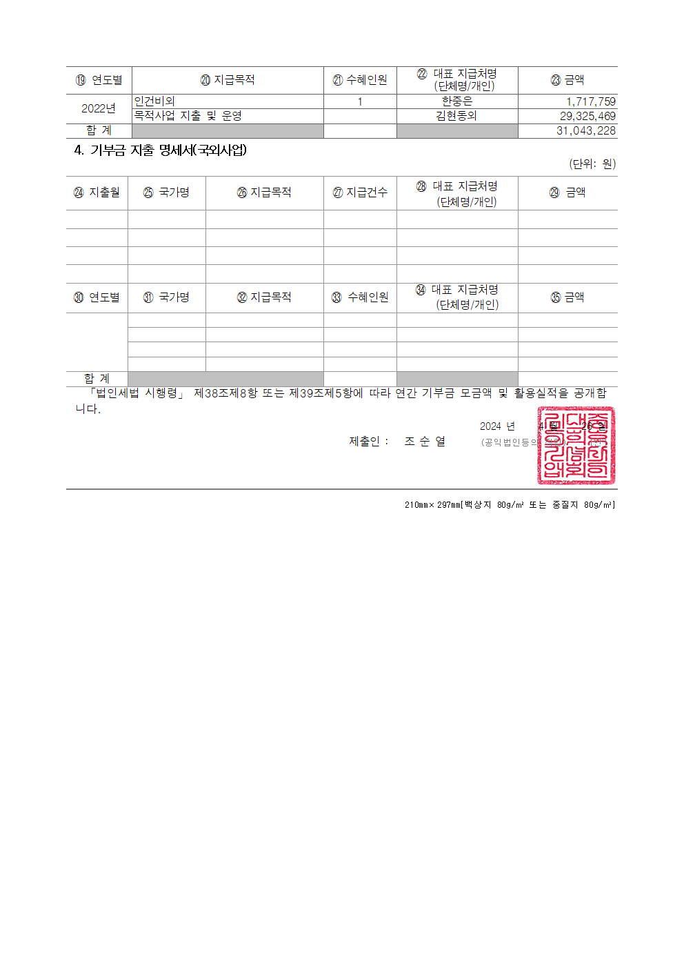2023 연간 기부금 모금액 및 활용실적 명세서 페이지 정보 작성자 기념사업회 댓글 댓글 0건 조회Hit 17회 작성일Date 26-02-11 15:44 본문 목록 댓글 0 댓글목록 등록된 댓글이 없습니다.